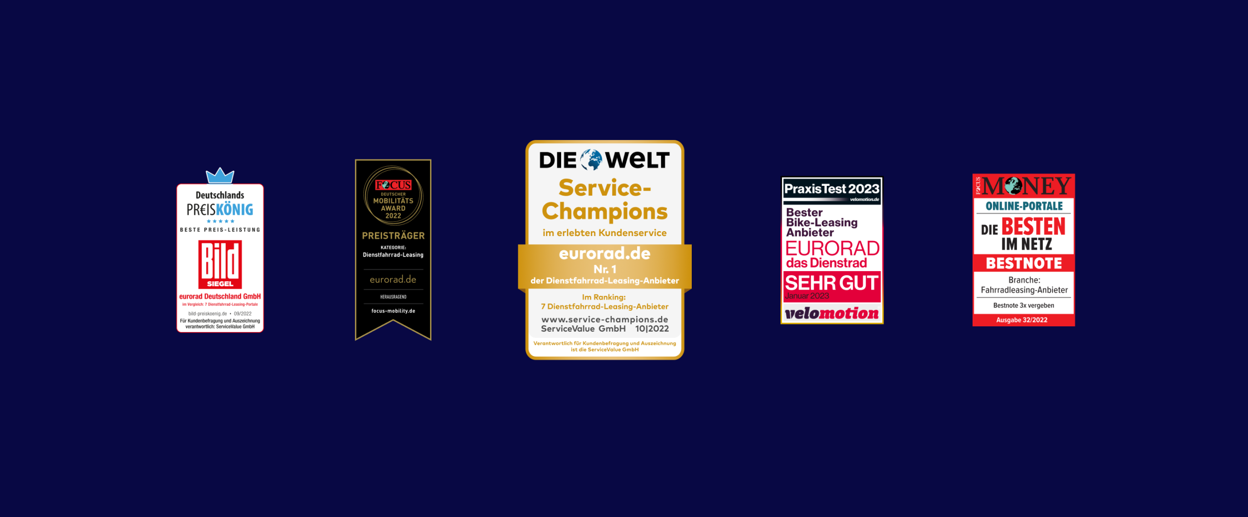 Die Untersuchung „Service-Champions“ erfolgt in Kooperation mit der überregionalen Tageszeitung DIE WELT und der Goethe-Universität Frankfurt am Main. Hierbei wurden insgesamt 2 Millionen Bewertungen eingeholt und durch ein wissenschaftlich fundiertes Ranking evaluiert. eurorad konnte in dieser Analyse den ersten Platz unter den Dienstfahrrad-Leasing-Angeboten erzielen und erreichte zudem eine herausragende 89 Platz im Gesamtranking aller Unternehmen.